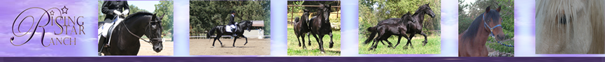 Return to Rising Star Ranch Home Page Calisto MHF - Homozygous Black P.R.E. Stallion! Visit our lovely ladies that run the Ranch! Choose your next Rising Star! Reserve your foal for next Spring See our newest additions to our family! Enjoy our photo album Check out Heidi's puppies Visit our friends We would love to hear from you